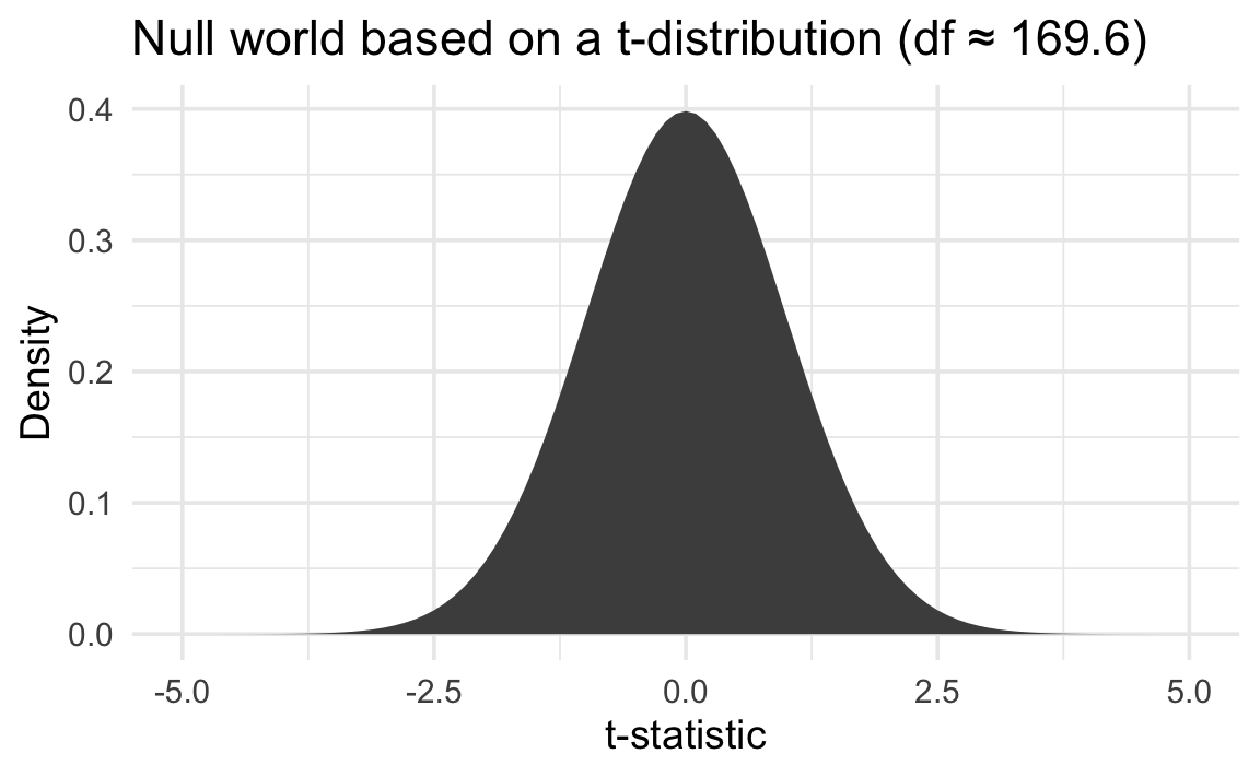 Since we’re not simulating the null world, we’re making strong assumptions about what the null world looks like. In the case of this t-test, we’re assuming it follows a t-distribution with 169.6 degrees of freedom. That looks like this: