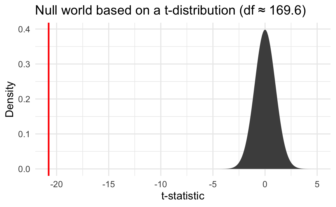 We can then put a standardized version of our observed \(\delta\)—the t value of -20.8—in that mathematical null world and find the exact probability of seeing it there: